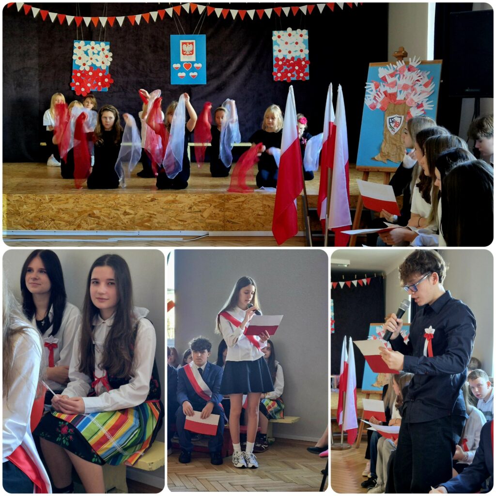 Montaż historyczno – muzyczny przygotowali uczniowie klas 8a i 8b, a śpiewem uświetnili zebrani w auli uczniowie.