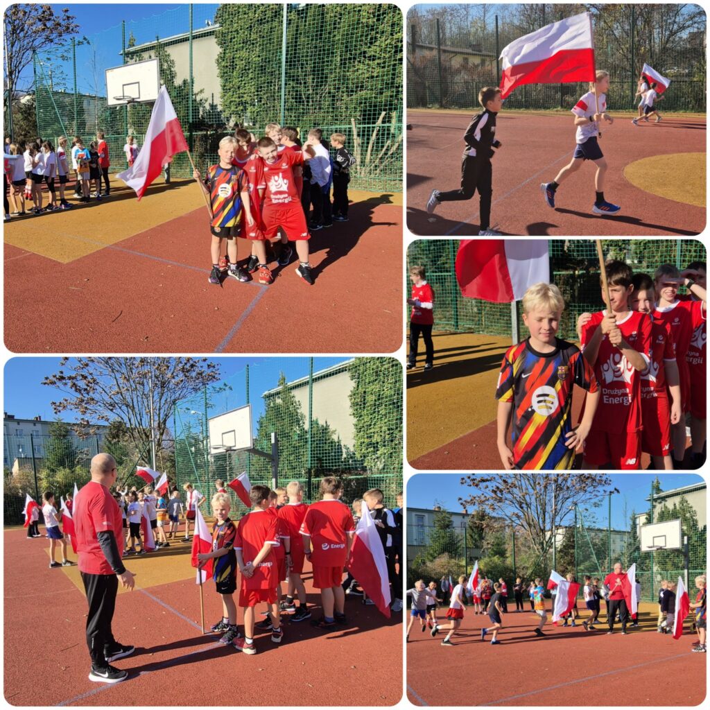 który miał na celu uczczenie Narodowego Święta Niepodległości. W wydarzeniu wzięli udział uczniowie wszystkich klas, którzy z entuzjazmem i dumą przebiegli i przemaszerowali trasę wokół boiska szkolnego. Uczestnicy, trzymając w rękach biało – czerwone flagi, ruszyli na wyznaczoną trasę, pokonując ją w radosnej i pełnej patriotyzmu atmosferze.