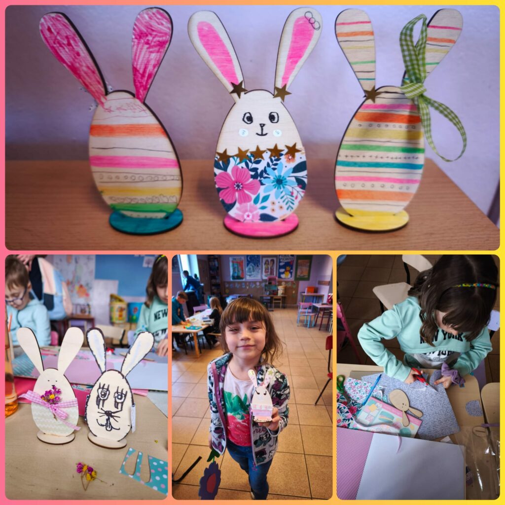 Dzieci zdobiły zajączki ze sklejki – każdy inny, każdy wyjątkowy. Było kolorowanie,