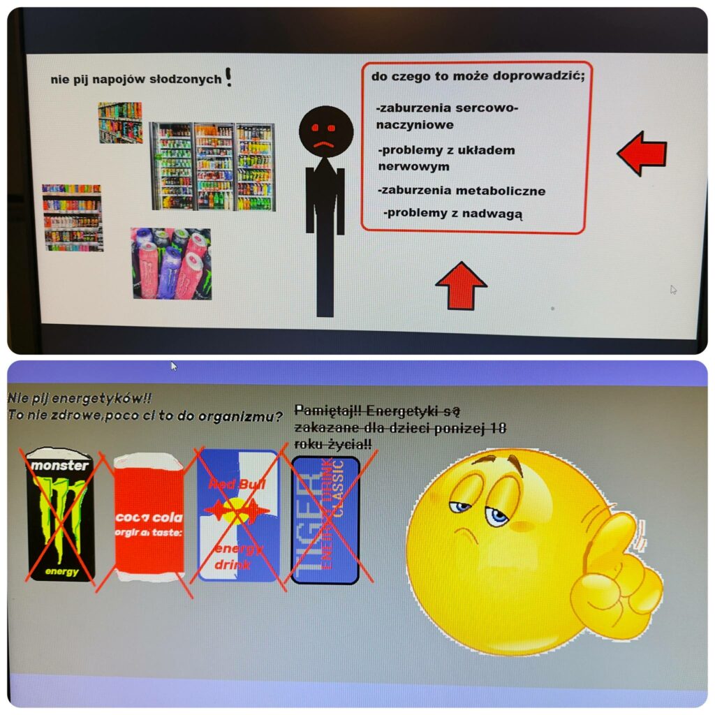 Efektem pracy były świetne, bardzo pomysłowe projekty, które pokazały nie tylko dobrą znajomość tematu, ale też umiejętność korzystania z narzędzi komputerowych. Było dużo ciekawych wniosków, kreatywnych pomysłów i świadomych refleksji na temat codziennych wyborów żywieniowych. Brawo za zaangażowanie i dojrzałe podejście do zdrowia!