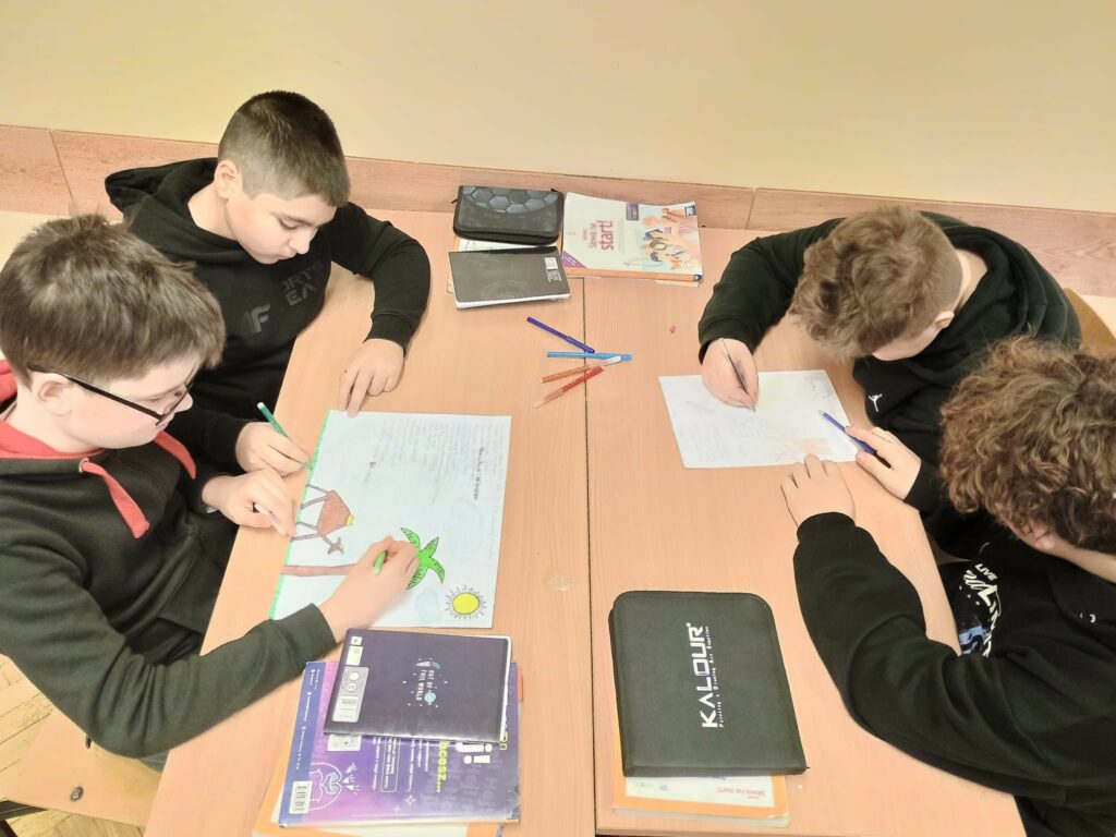 W części kreatywnej uczniowie w pełnym zaangażowaniu poświęcili się zadaniu edukacyjnemu – wykonali i zaprezentowali projekty – oferty wymyślonego biura podróży „Śladami Stasia i Nel”.