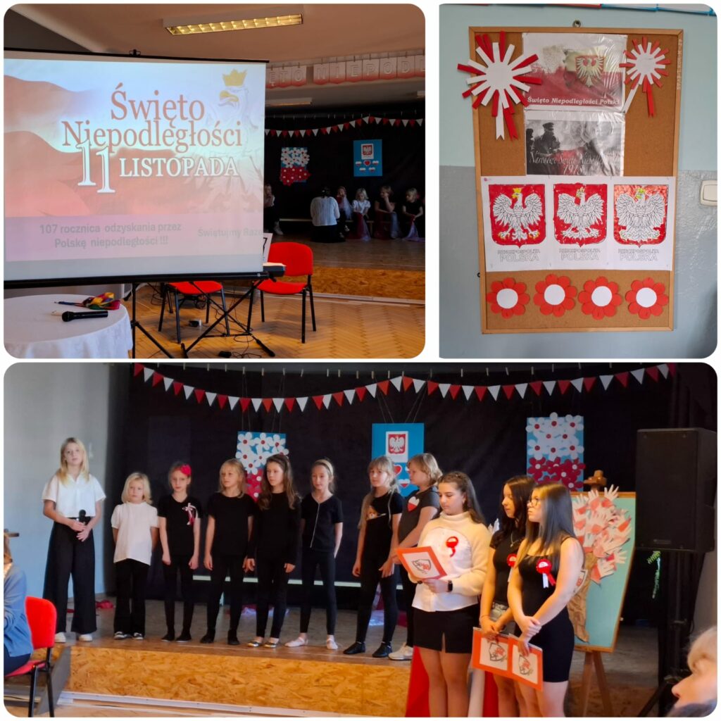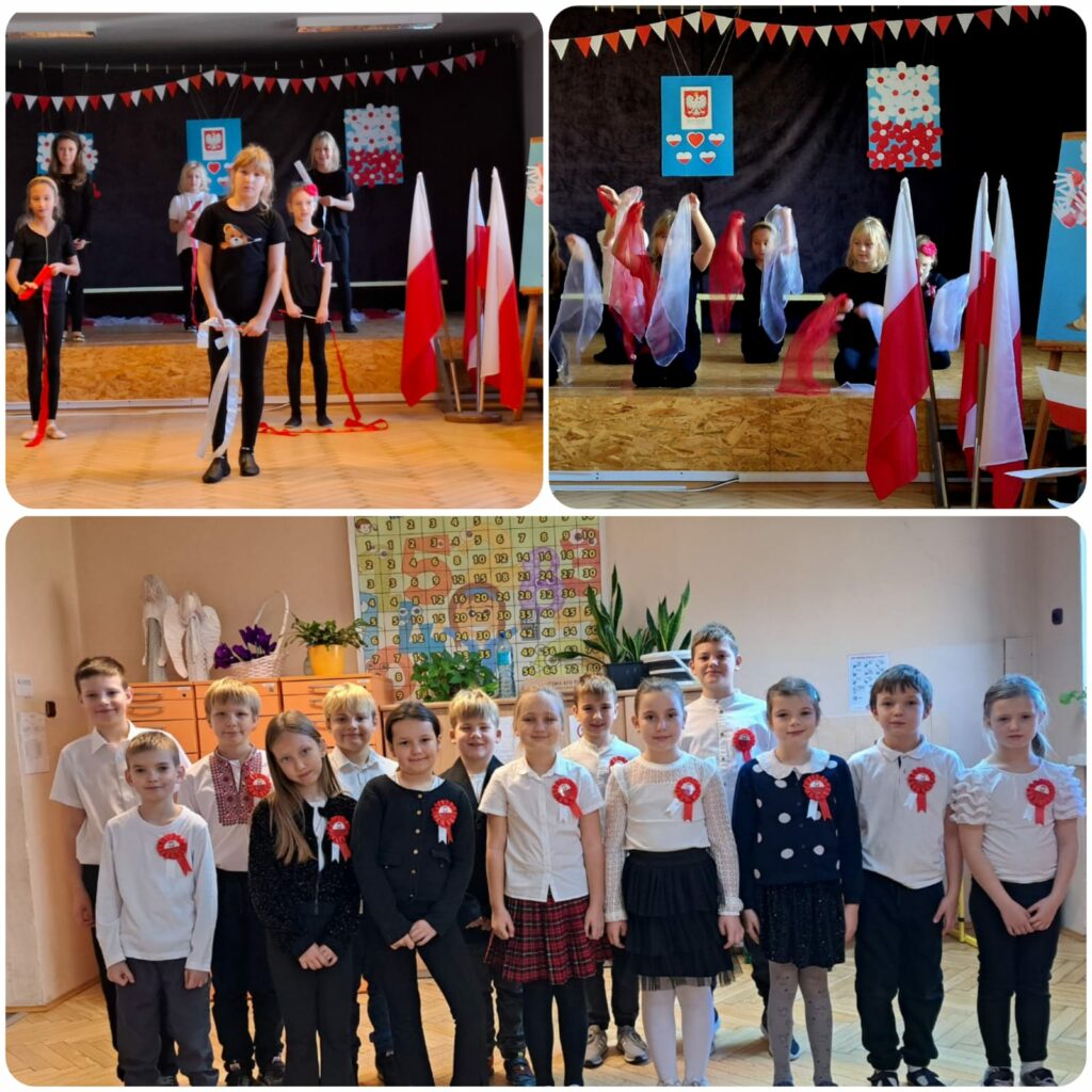 7 listopada uczniowie klas 1 – 4 uczestniczyli w uroczystych obchodach Narodowego Święta Niepodległości. W przygotowaniu uroczystości wzięli udział wszyscy uczniowie klas 1 – 4 wykonując m. in. kotyliony narodowe, dekoracje sal lekcyjnych. Uczestnicy zajęć rytmiki i zespołu wokalnego zaprezentowali: dwa tańce w barwach narodowych oraz piosenki: „Moja Ojczyzna” i „Rozkwitały pąki białych róż”. Zebrani obejrzeli krótki film „11 listopada – Narodowe Święto Niepodległości”. Wszyscy uczniowie zaśpiewali piosenkę „Jestem Polką i Polakiem”.