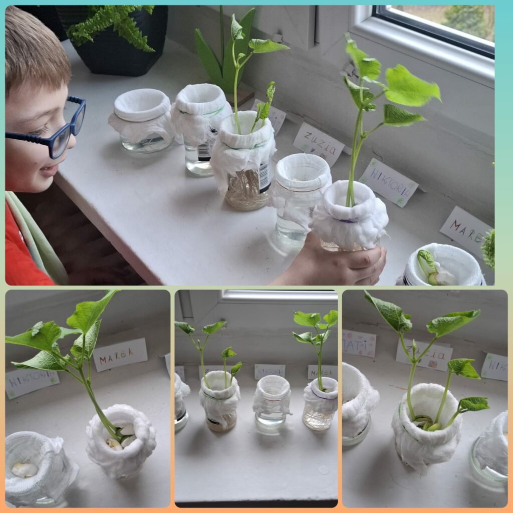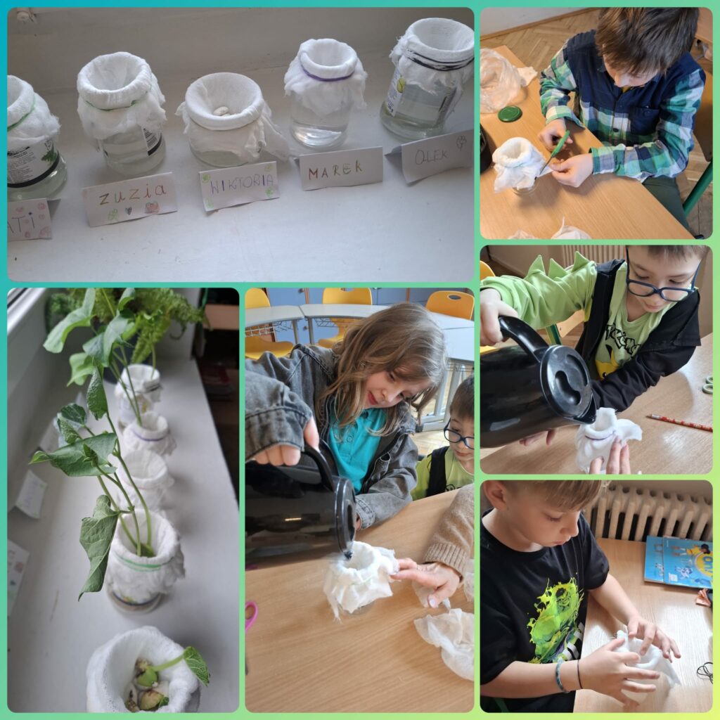 Klasa 2b wykonała zadanie przyrodnicze i założyła hodowlę fasolki w słoikach. Uczniowie starannie przygotowali nasiona, wsadzili je do słoików, a następnie codziennie podlewali swoje roślinki. Prowadzili dziennik obserwacji, notując zmiany, które zachodziły w fasolkach z dnia na dzień. Oglądali wzrost korzeni, łodyg i liści, sprawdzali, jak roślina reaguje na światło i wodę, a także wspólnie dyskutowali o tym, co jest jej potrzebne do prawidłowego rozwoju. Po kilku tygodniach pod ich opieką wyrosły piękne okazy! ![]()