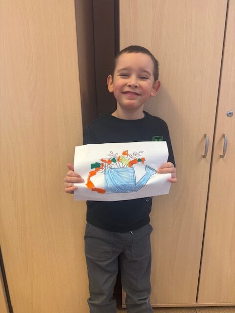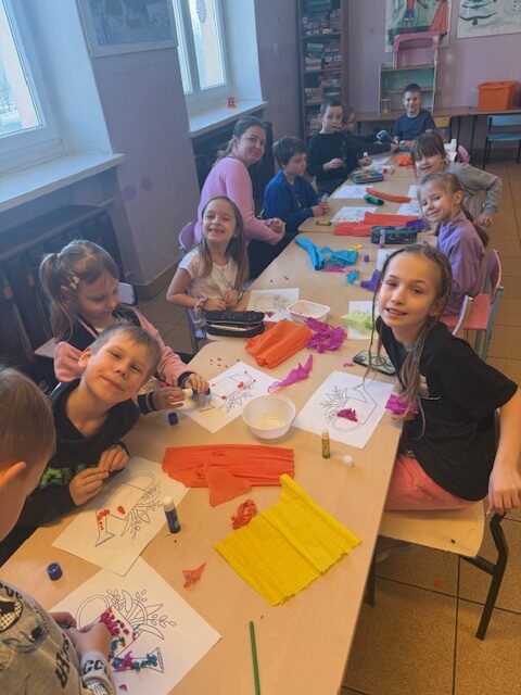 Podczas zajęć na świetlicy szkolnej uczniowie wykonali pracę plastyczną techniką mieszaną. Prace przedstawiają konewki z bukietem kwiatów. Wykonywaniu prac towarzyszyła atmosfera wspomnień związanych z czasem spędzonym z babcią i dziadkiem.