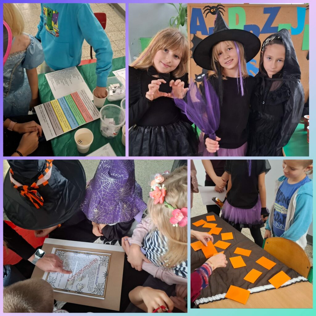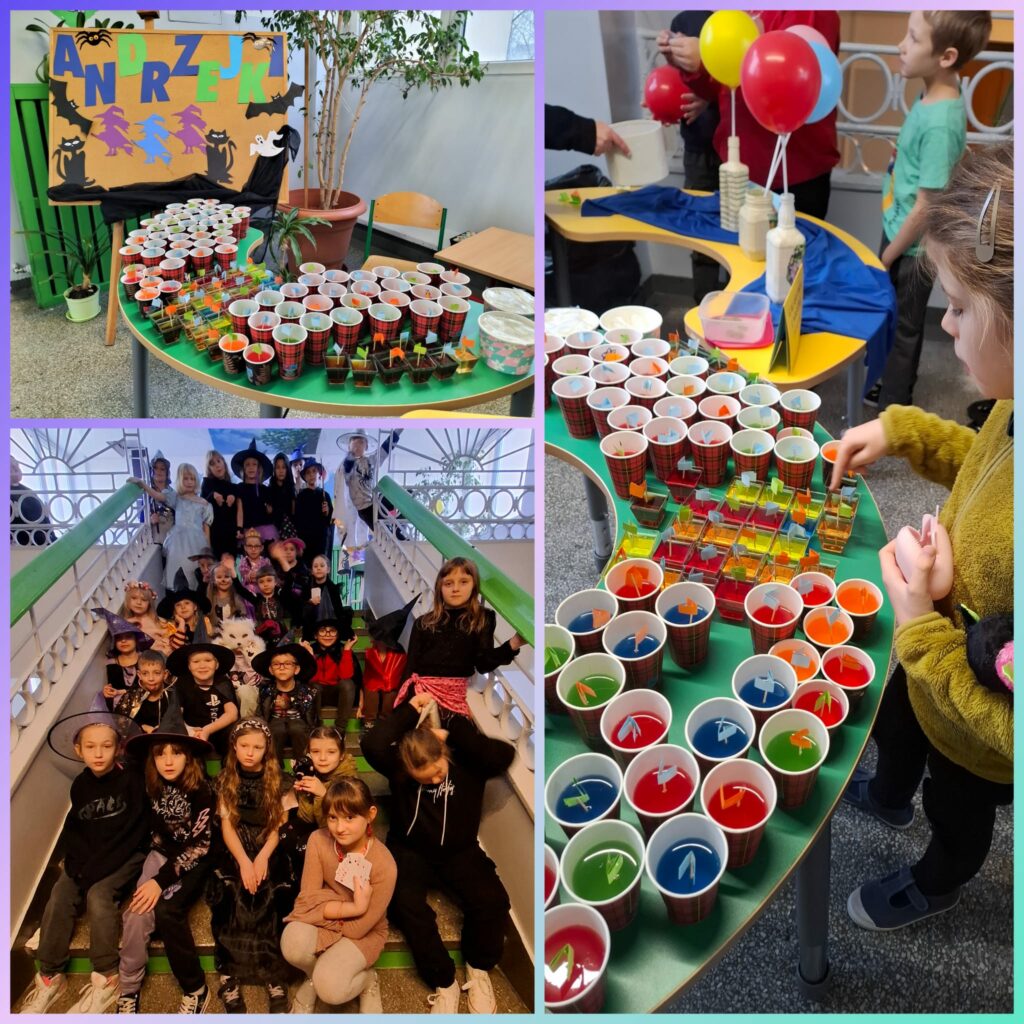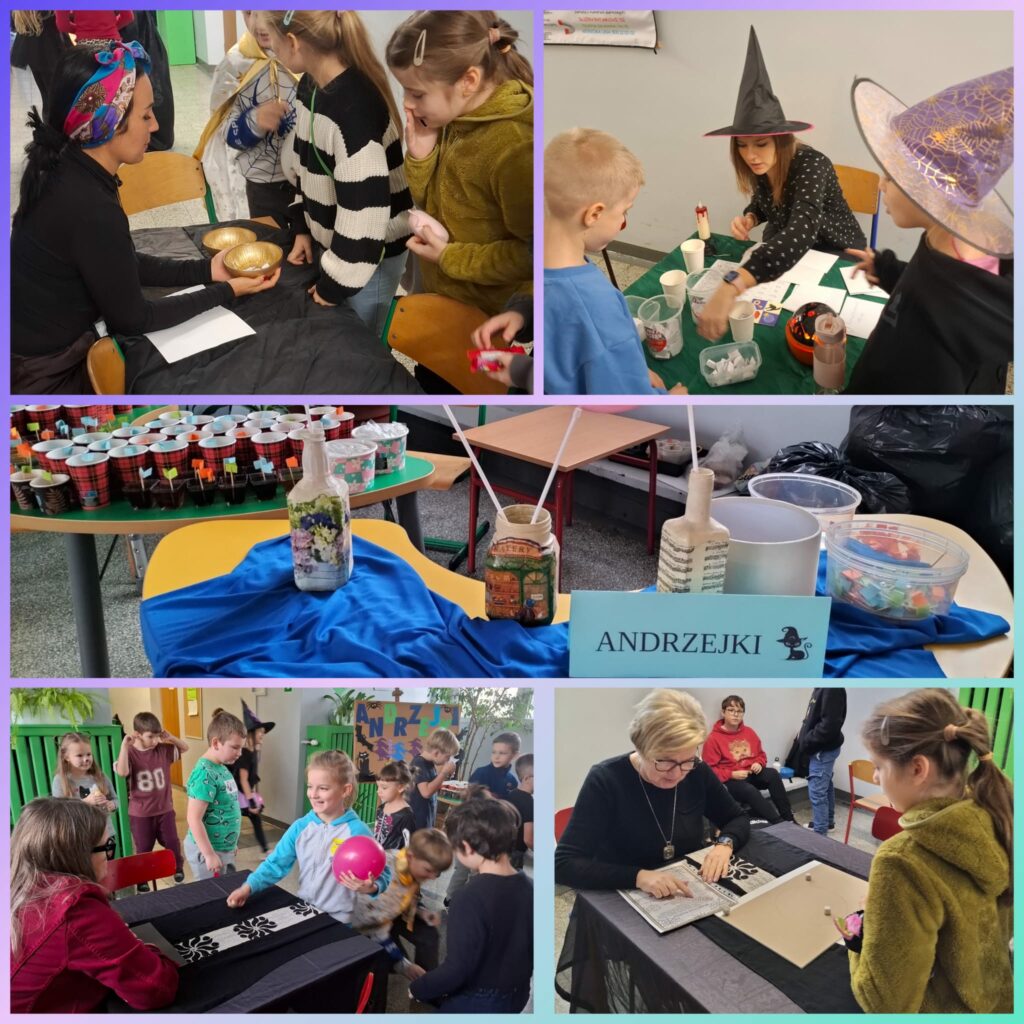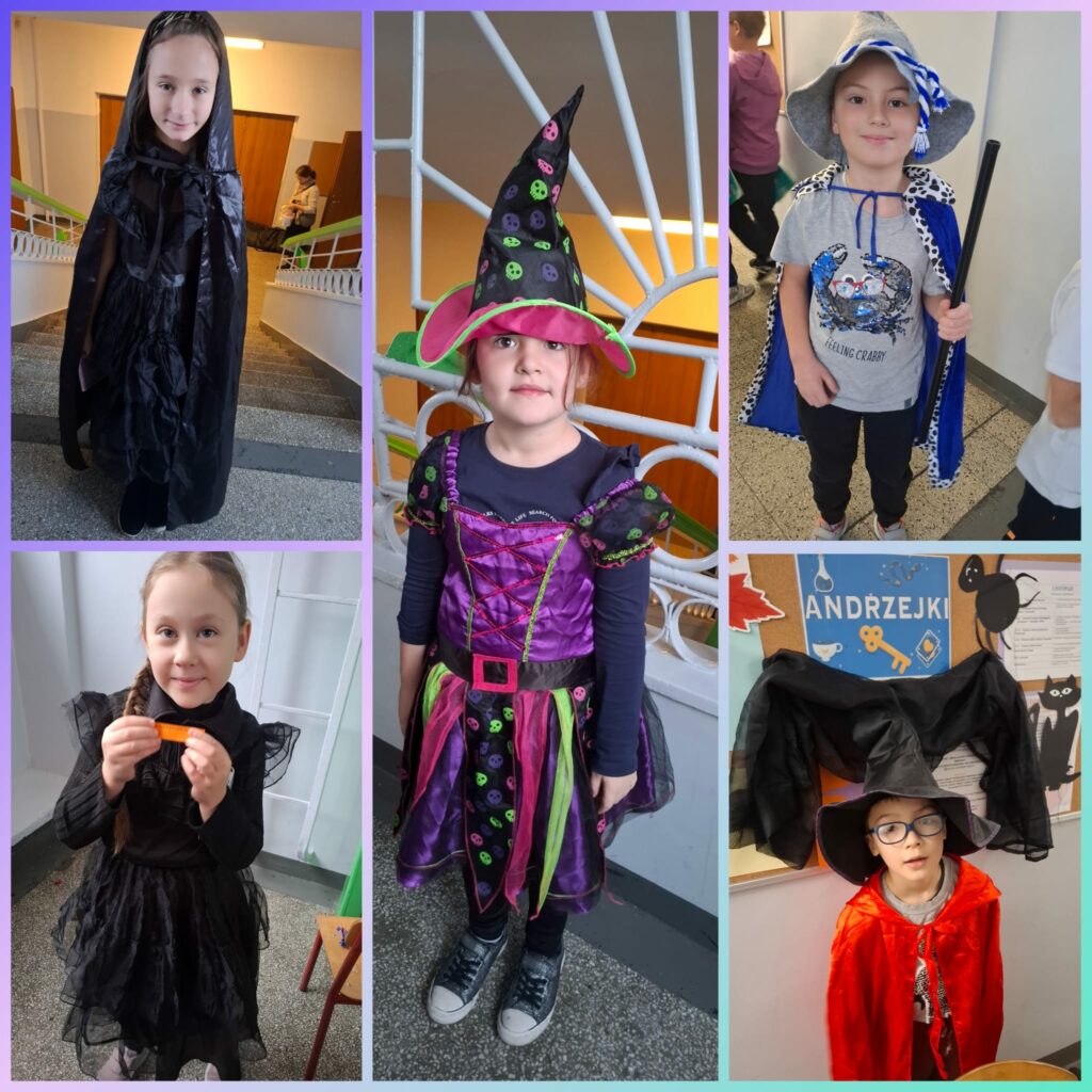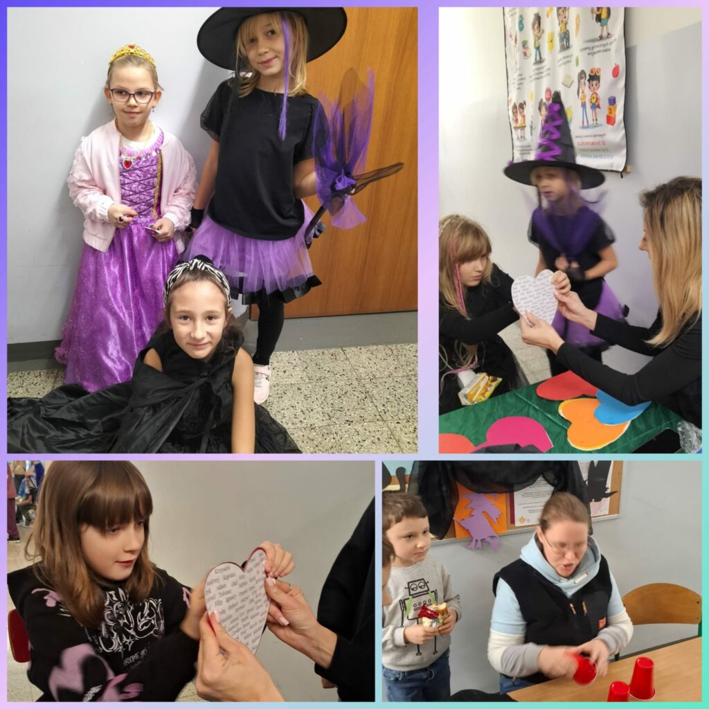 🪄🤹‍♀️„Poranek andrzejkowy” uczniów klas I – IV upłynął w atmosferze magii i dobrej zabawy. Dzieci, przebrane za wróżki, czarodziejów i czarownice, cyganki, czarne koty, od samego wejścia wprowadziły nas w świat przepełniony czarami i niespodziankami. Pojawiły się różne stanowiska wróżb, a każde z nich kryło jakąś tajemnicę. Jedną z atrakcji były wróżby z kostkami 🎲do gry – każdy rzut odkrywał symboliczne znaczenie i zapowiadał przyszłe przygody. Dużo emocji wzbudzała andrzejkowa gra planszowa,🤹‍♂️ w której każde pole kryło niespodziankę lub magiczne zadanie. Nie zabrakło też tradycyjnej wróżby z papierowym sercem❤️ z imionami dziewcząt i chłopców. Całość dopełniły słodkie galaretki🍨 z ukrytymi wróżbami oraz wróżby w balonach, które pękając, odsłaniały kolorowe karteczki z przepowiedniami. Ten wyjątkowy poranek był pełen radości, ciekawości i tajemnicy – dokładnie tak, jak przystało na andrzejkowe czary.