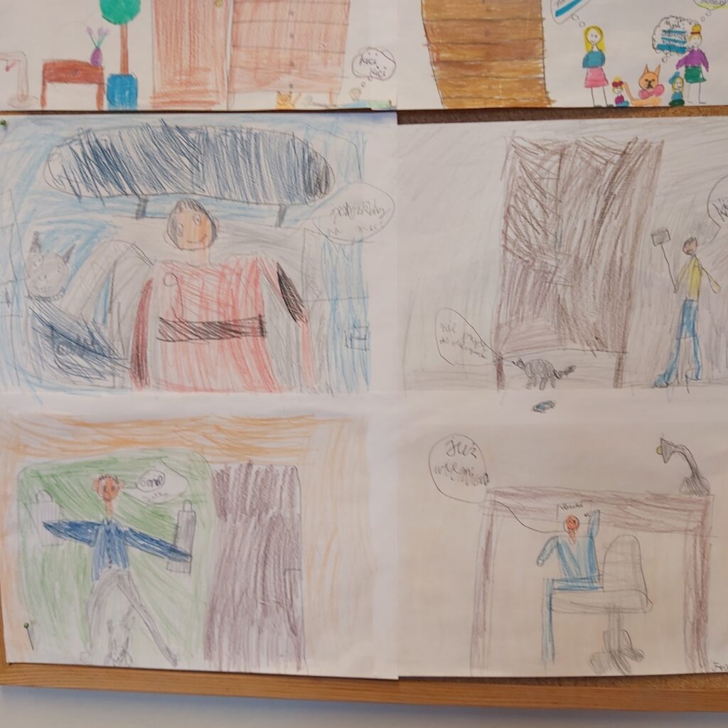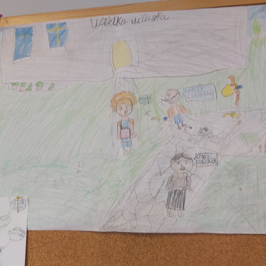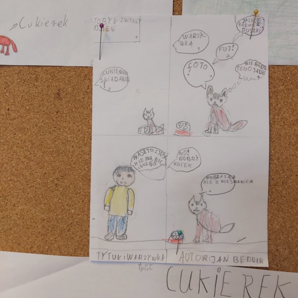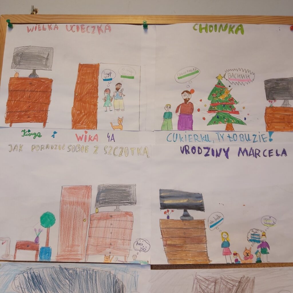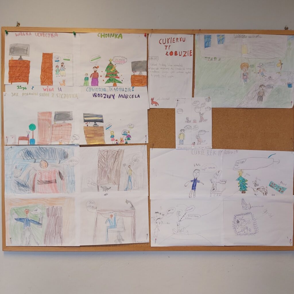 Klasa 4a wzięła udział w realizacji projektu „Cukierek w komiksie” w ramach Narodowego Programu Rozwoju Czytelnictwa. Projekt edukacyjny został zrealizowany w ramach zajęć bibliotecznych i lekcji wychowawczych. Uczniowie poznali fragment książki pt. „Pomocy, Cukierku!” przedstawiającej zabawne przygody niesfornego kota. Podczas zajęć dzieci rozmawiały o bohaterach i ich zachowaniu, a następnie tworzyły własne komiksy i rysunki inspirowane tekstem. Uczniowie pracowali w grupach a ich prace zostały przedstawione na gazetce szkolnej.