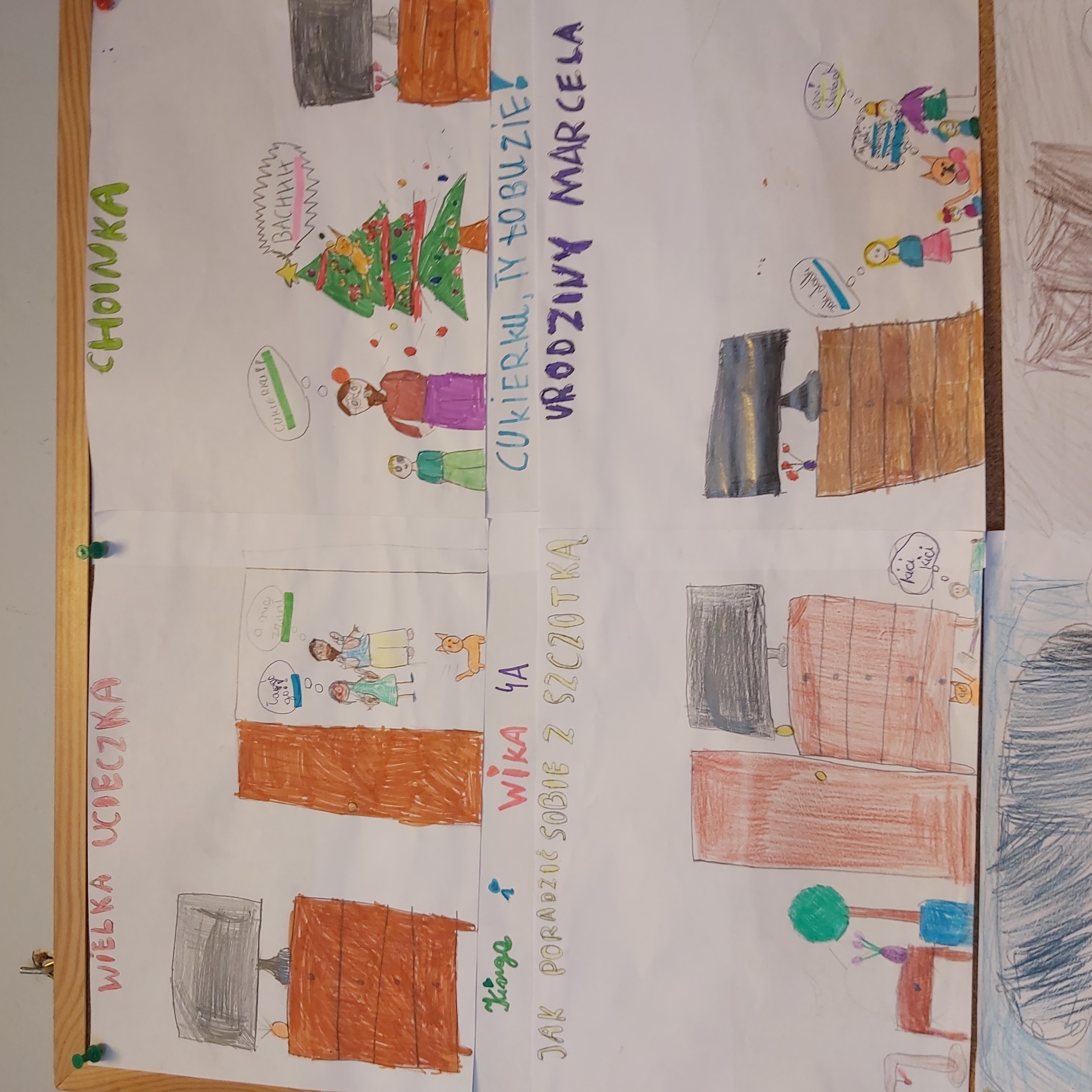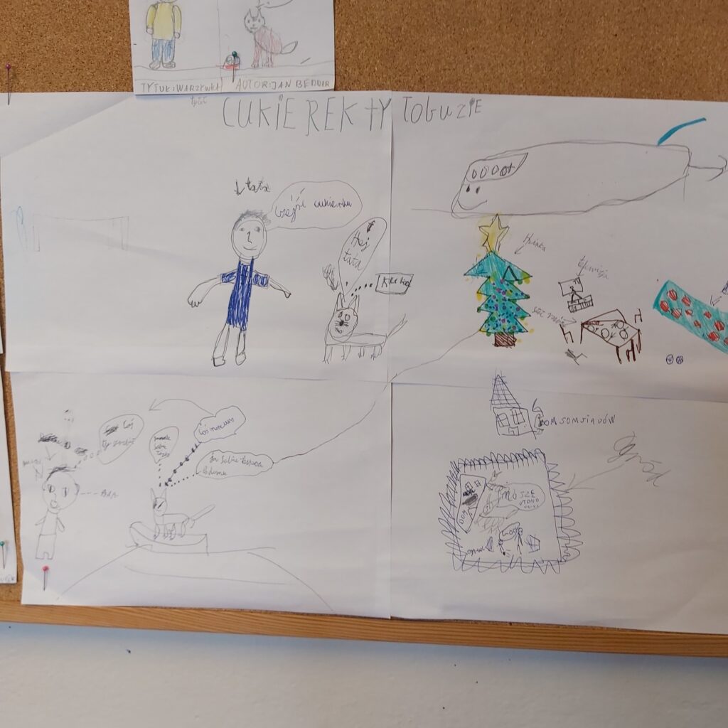Klasa 4a wzięła udział w realizacji projektu „Cukierek w komiksie” w ramach Narodowego Programu Rozwoju Czytelnictwa. Projekt edukacyjny został zrealizowany w ramach zajęć bibliotecznych i lekcji wychowawczych. Uczniowie poznali fragment książki pt. „Pomocy, Cukierku!” przedstawiającej zabawne przygody niesfornego kota. Podczas zajęć dzieci rozmawiały o bohaterach i ich zachowaniu, a następnie tworzyły własne komiksy i rysunki inspirowane tekstem. Uczniowie pracowali w grupach a ich prace zostały przedstawione na gazetce szkolnej.