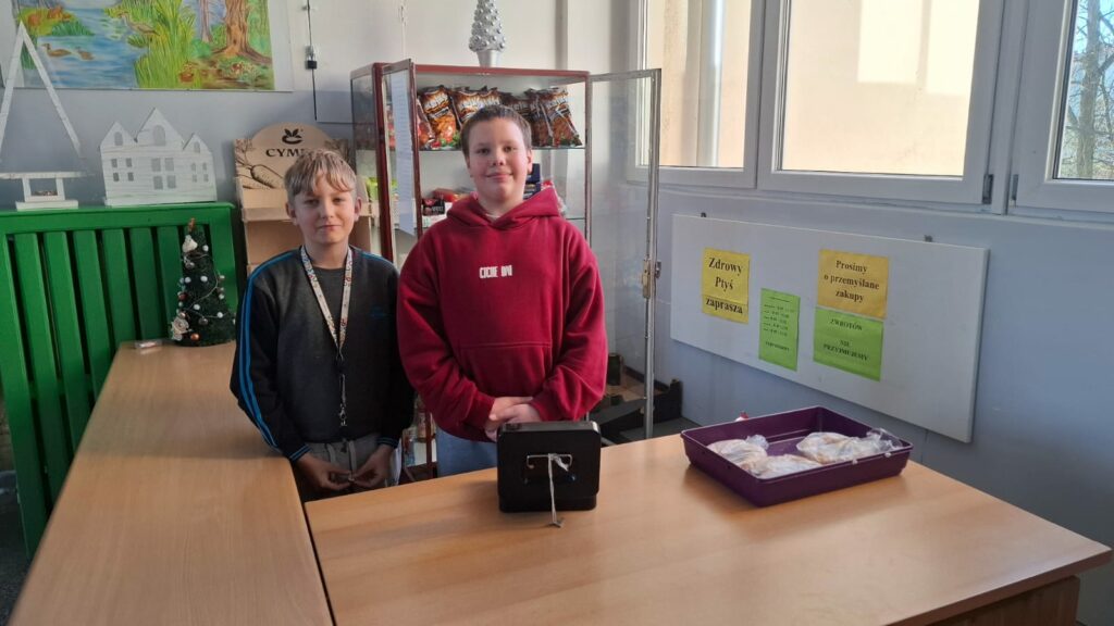 odpowiednim zaopatrzeniem sklepiku i sprzedażą świeżych drożdżówek, słodyczy, napojów, napojów