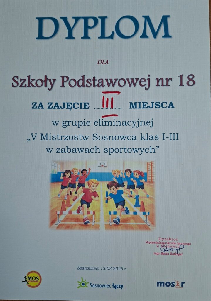 Reprezentacja Naszej Szkoły 13 marca wzięła udział w turnieju eliminacyjnym „V Mistrzostw Sosnowca klas 1 – 3 w zabawach sportowych”. Zawody odbyły się na hali sportowej AKSu „Niwka” Sosnowiec. Uczestnicy mieli okazję spróbować swoich sił w ośmiu konkurencjach. Nasi uczniowie dali z siebie wszystko, rywalizując pokazali duże umiejętności motoryczne, kompetencje społeczne i osobiste. Praca zespołowa i gotowość do wysiłku była na najwyższym poziomie. Ostatecznie Osiemnastka uplasowała się na III miejscu, nasi podopieczni świetnie się bawili na piątkowej „wycieczce sportowej”.